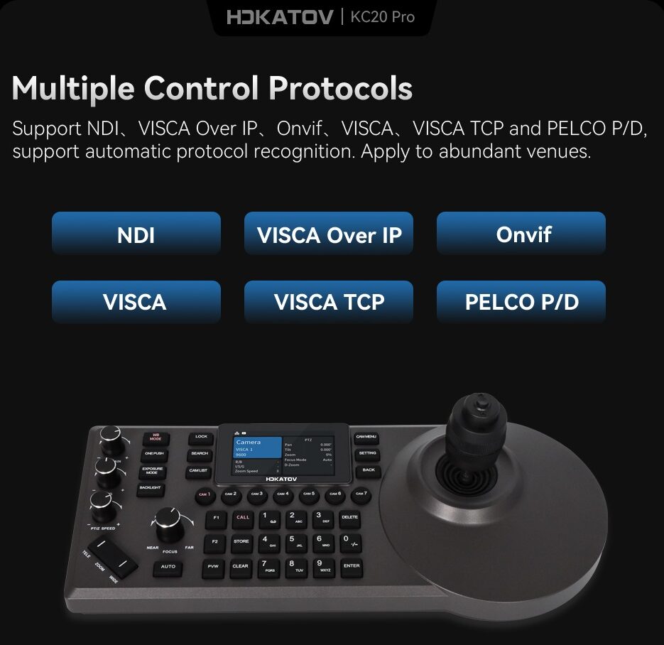 PUS-KB100 to profesjonalny kontroler wideo PTZ z wbudowanymi wieloma protokołami VISCA, SONY VISCA, PELCO P/D, obsługuje RS422/RS485/RS232/IP (VISCA OVER IP) itp. Jest kompatybilny z kamerami SONY, PANASONIC, DATAVIDEO, Lumens, PTZ Optics, AIDA, Marshall i innymi. Posiada prostą konfiguracja i jest łatwy w obsłudze. Ma 7-kanałowy przycisk skrótu kanału kamery i 3 nieskończone przyciski obrotu oraz ręczny i automatyczny tryb ustawiania ostrości dla elastycznego przełączania.
